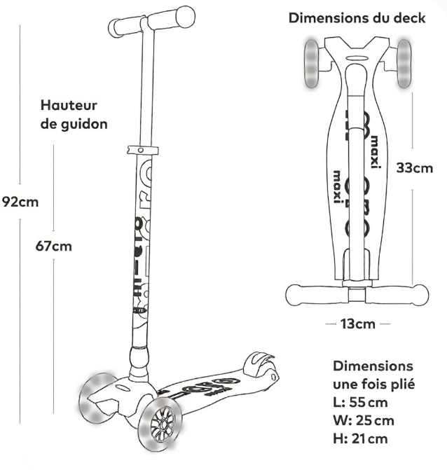 Alors que la Maxi est parfaite pour les enfants de 5 à 12 ans, souhaitant rouler sur une trottinette à trois roues, avec un guidon ajustable de 61 à 85 cm.