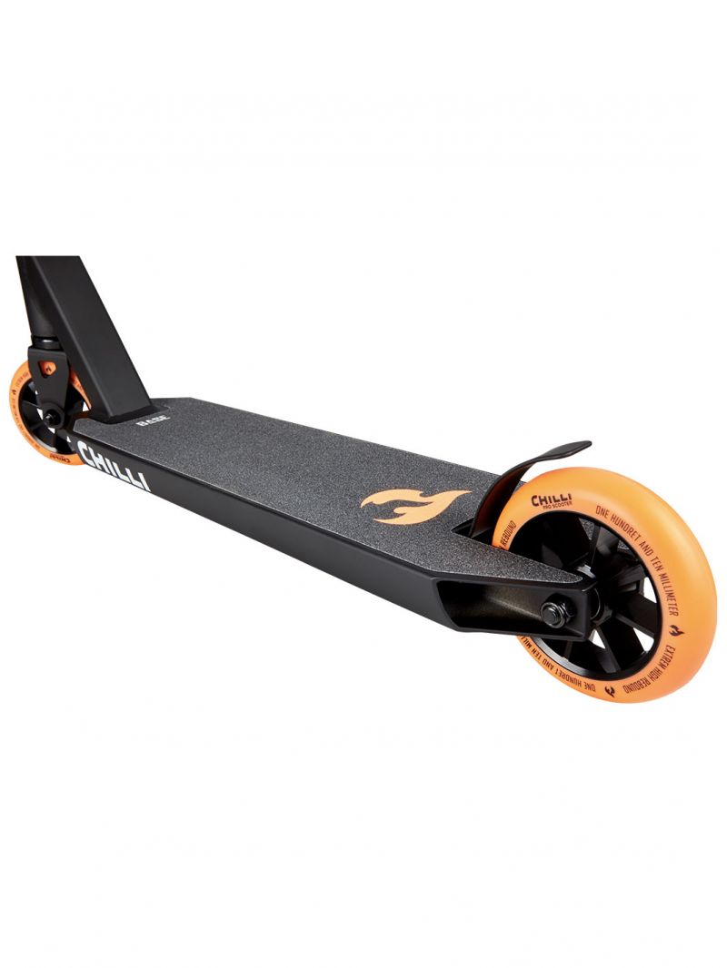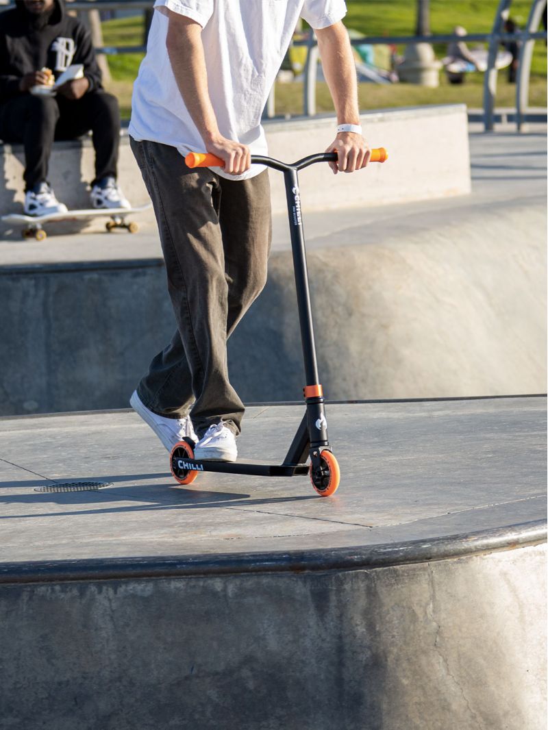 La trottinette freestyle Chilli Base Orange est le modèle idéal pour débuter dans le freestyle, quel que soit son âge. Elle est équipée des meilleurs matériaux et offre un excellent rapport qualité/prix. Avec ses 50 cm de long et ses 11,5 cm de large, le deck offre un espace parfait pour une bonne stabilité. L'unité de couleur entre le collier de serrage double vis, les roues, et les poignées apporte un look simple et élégant. Elle combine légèreté et résistance grâce à son système de compression HIC universel. La trottinette Chilli Base offre au rider débutant leurs premières sensations en Freestyle sans faire de compromis sur la qualité et la sécurité.