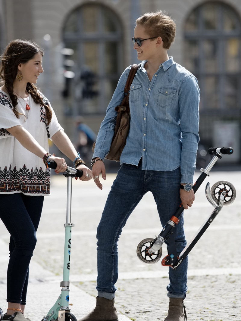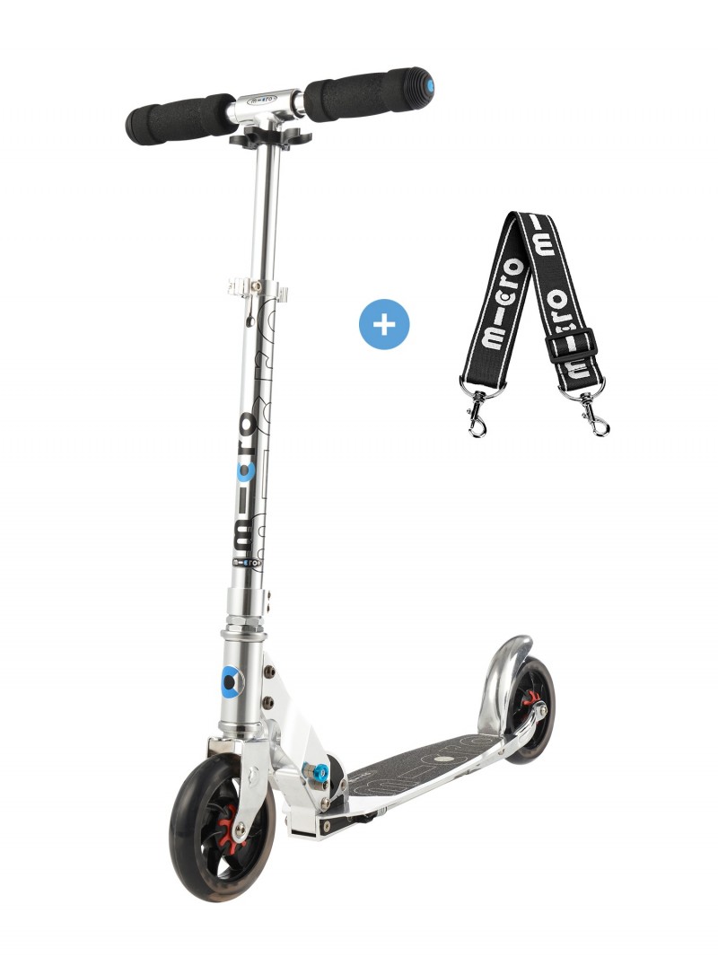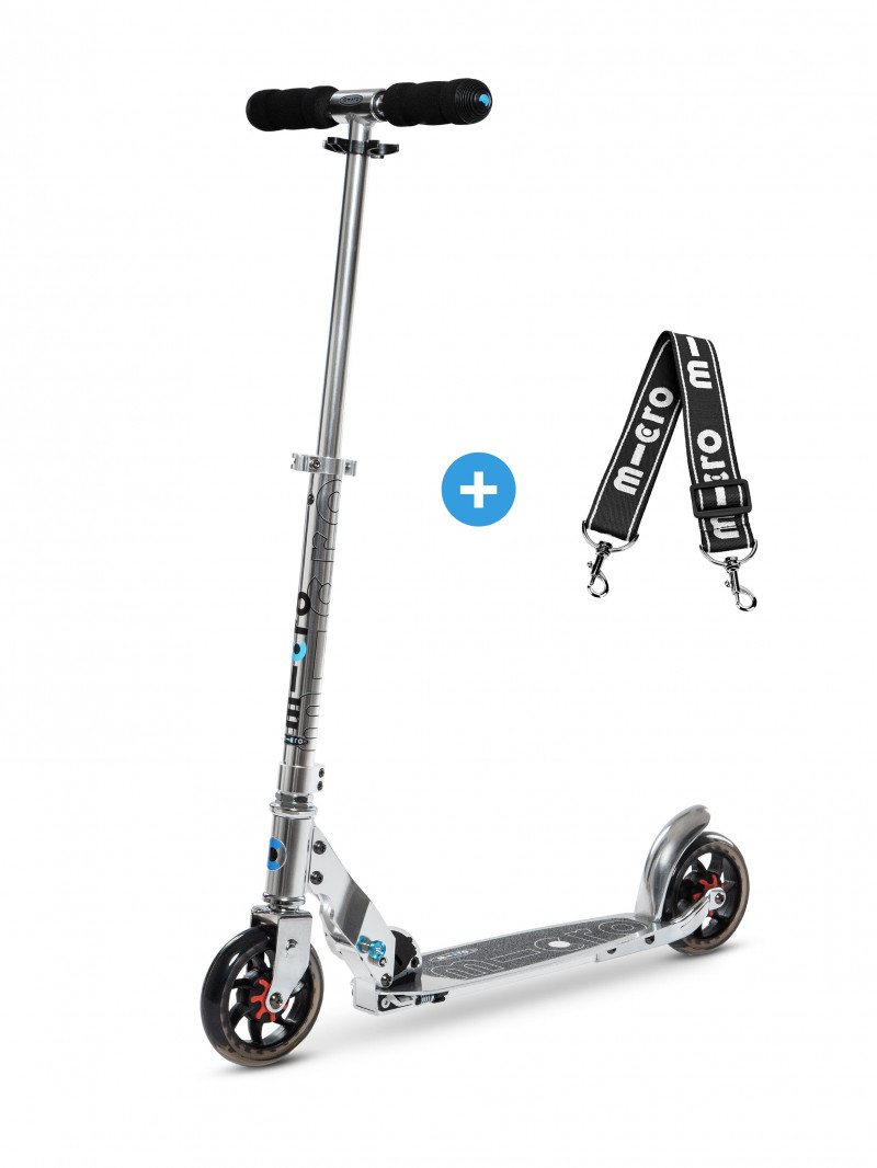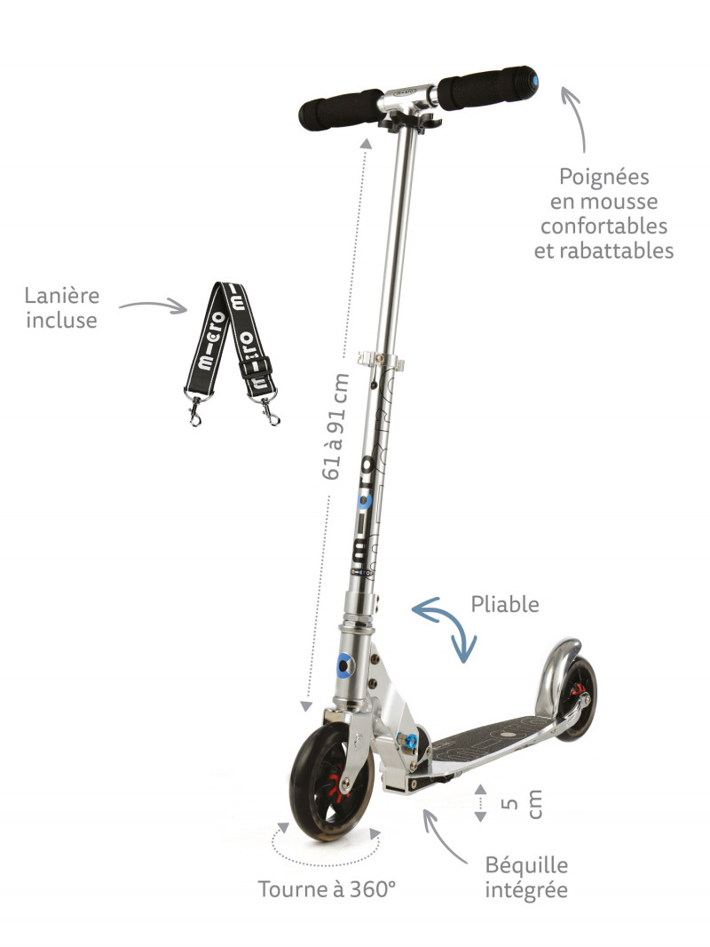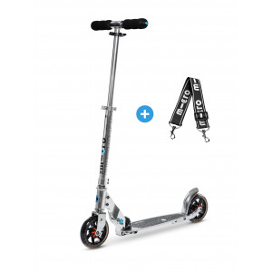 Pliables, compactes et légères la Micro Speed+, Micro Flex 145 mm et la Micro Sprite se transportent facilement. De plus en ajoutant une lanière de transport, vous pourrez porter facilement cette trottinette adulte à l’épaule.
