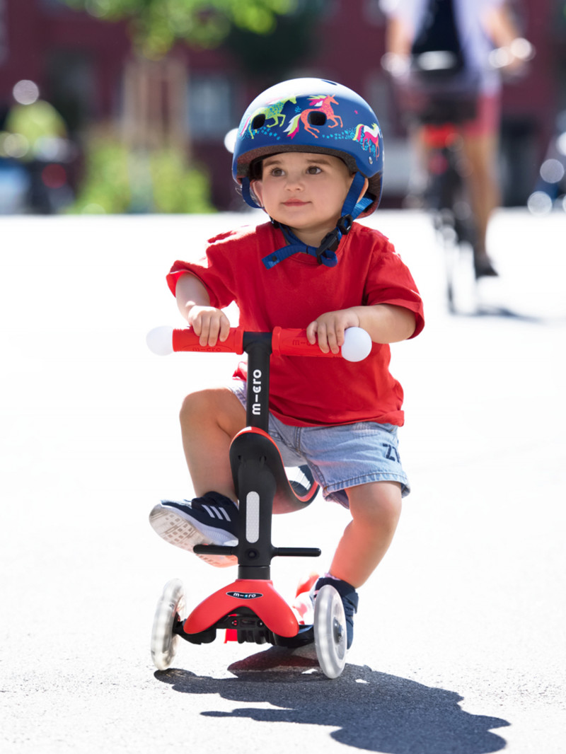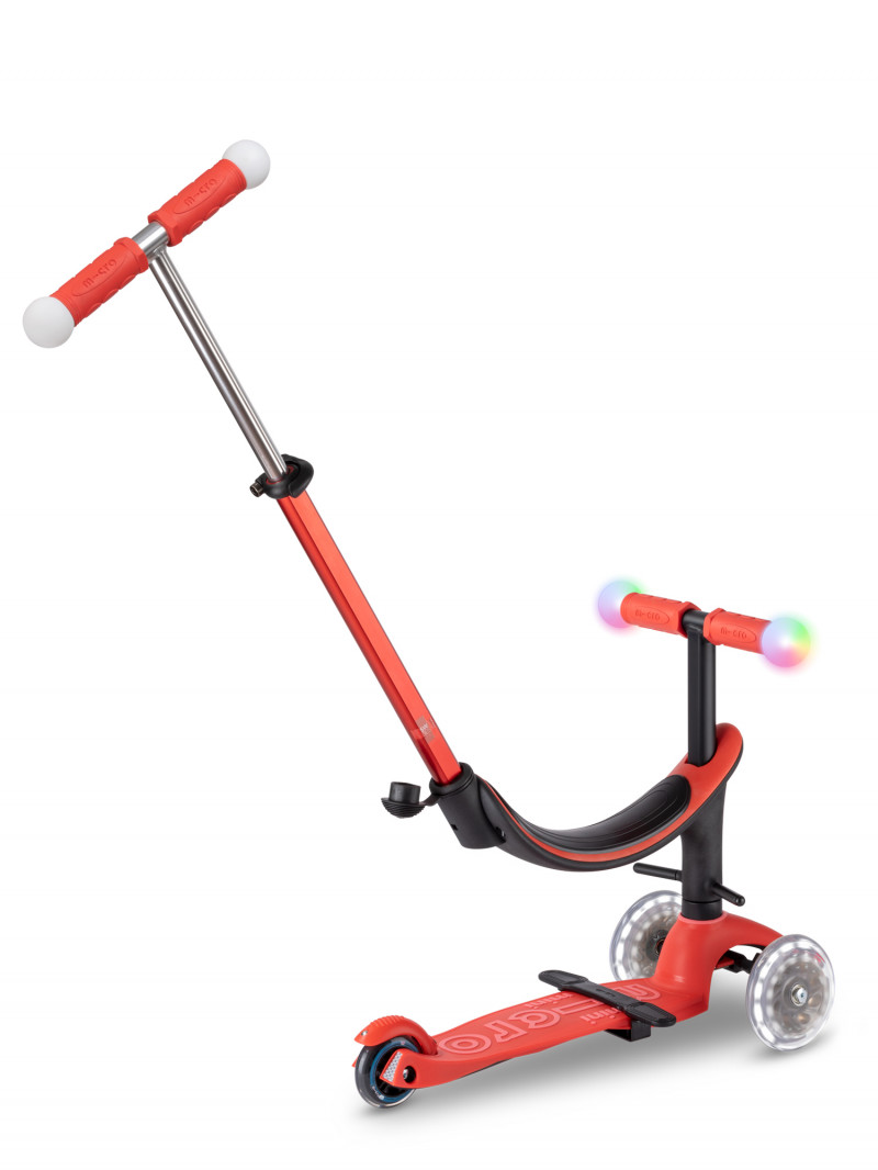 La Mini 2Go Deluxe fonctionne de la même manière que la Mini Micro 3-en-1. La principale différence est que cette trottinette évolutive est équipée d’un coffre amovible spacieux pour ranger les petits trésors des enfants et d’un siège large et confortable.