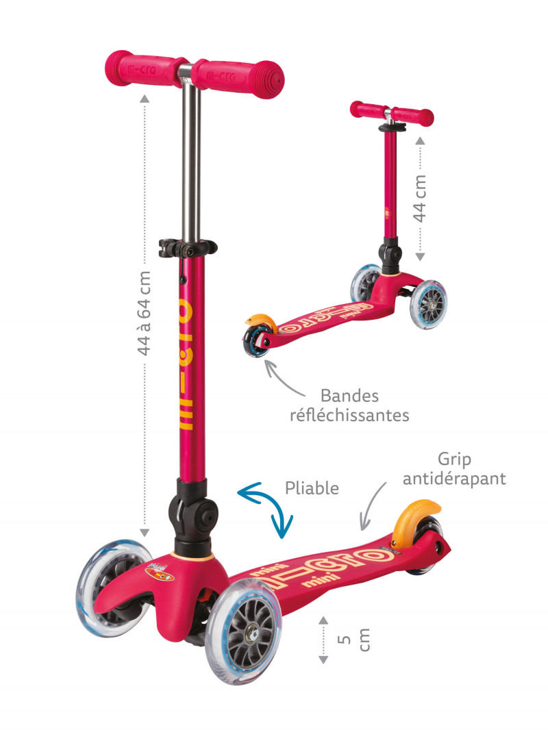 La Mini Micro est idéale pour les enfants de 2 à 5 ans avec un guidon ajustable parfaitement en hauteur de 44 à 64 cm.
