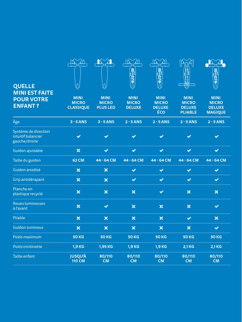 Il existe plusieurs modèles de Mini Micro. Découvrez leurs caractéristiques :