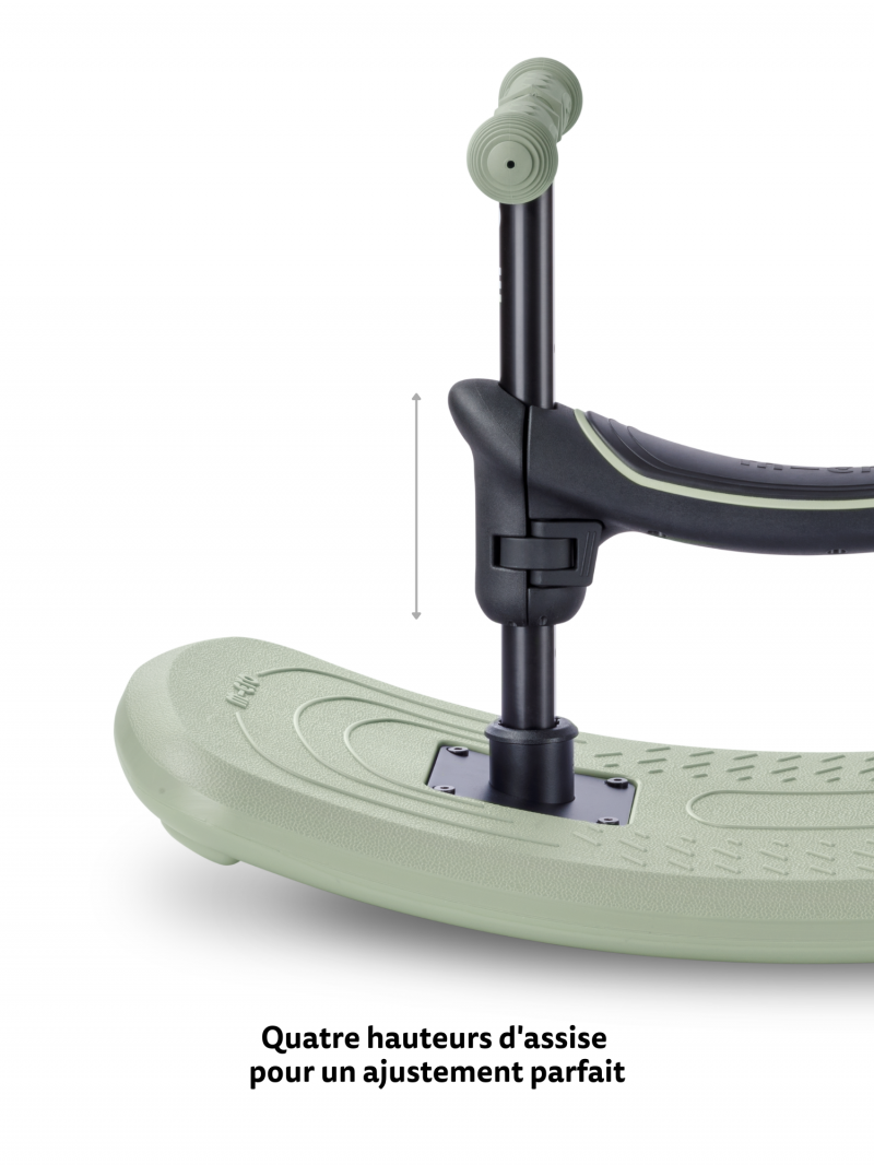 La base de bascule est stable, légère et antidérapante, avec quatre butées intégrées qui empêchent les basculements excessifs. Le siège réglable en hauteur est doté d’une surface texturée pour éviter les glissements, et se règle facilement sur une des 4 position en hauteur sans outil. Le guidon à réglage millimétrique s’adapte parfaitement à la taille de votre enfant, tandis que les poignées en caoutchouc souple assurent une bonne prise en main.
