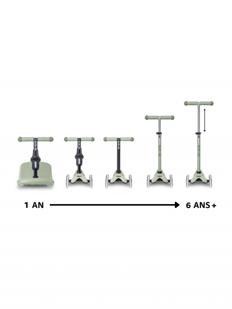 Les trottinettes Mini Micro 3-en-1 grandissent avec votre enfant. Utilisée dans un premier temps comme un porteur (le siège se règle en hauteur), vouspourrez pousser votre enfant avec la barre de poussée télescopique et amovible. En grandissant vous pourrez retirer le siège et votre enfant commencera à appréhender l’utilisation de sa trottinette. Pour finir vous pourrez installer la barre en T.