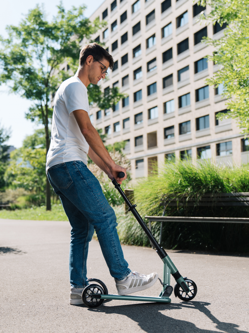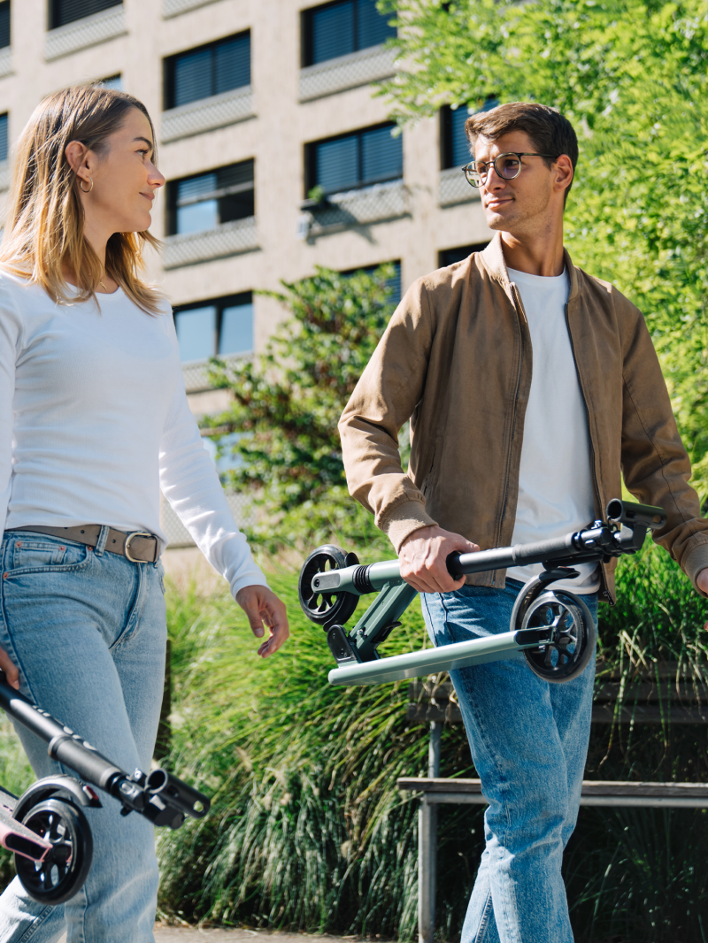 Le pliage mains libres de cette trottinette est la star du spectacle. D'un simple coup de pied, celle-ci se replie de manière ultra compacte. C'est un système mains libres, sans souci, qui vous permet de vous mettre en route en quelques secondes. Elle est parfaite pour être mise à l'arrière de la voiture, transportée dans les transports en commun ou rangée à la maison.