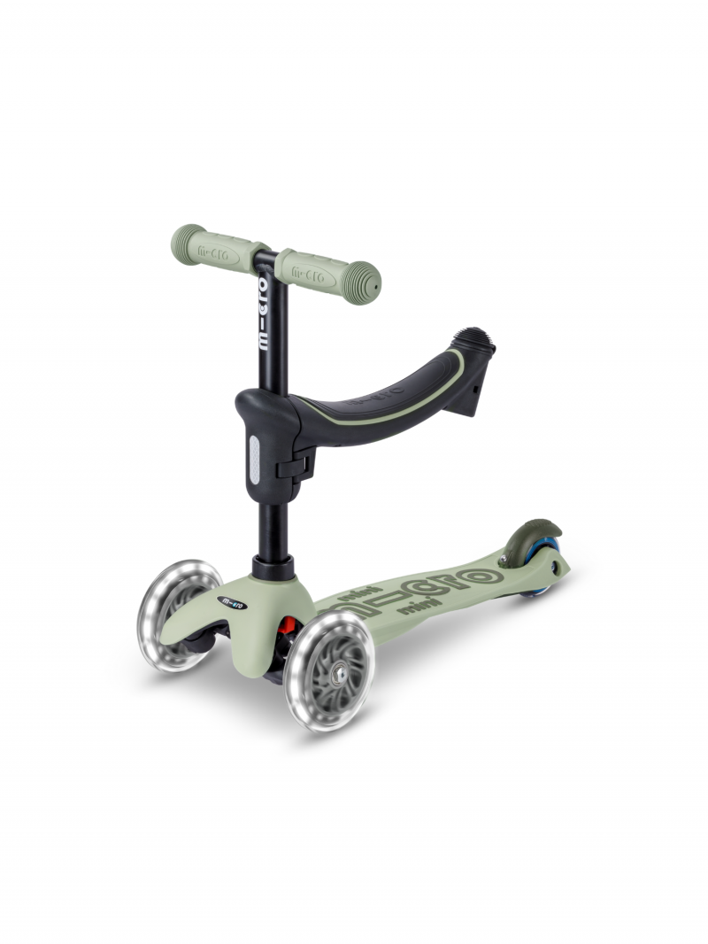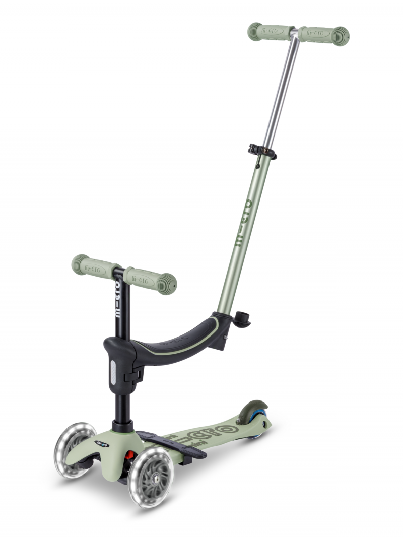 Les trottinettes Mini Micro 3-en-1 grandissent avec votre enfant. Utilisée dans un premier temps comme un porteur (le siège se règle en hauteur), vouspourrez pousser votre enfant avec la barre de poussée télescopique et amovible. En grandissant vous pourrez retirer le siège et votre enfant commencera à appréhender l’utilisation de sa trottinette. Pour finir vous pourrez installer la barre en T.