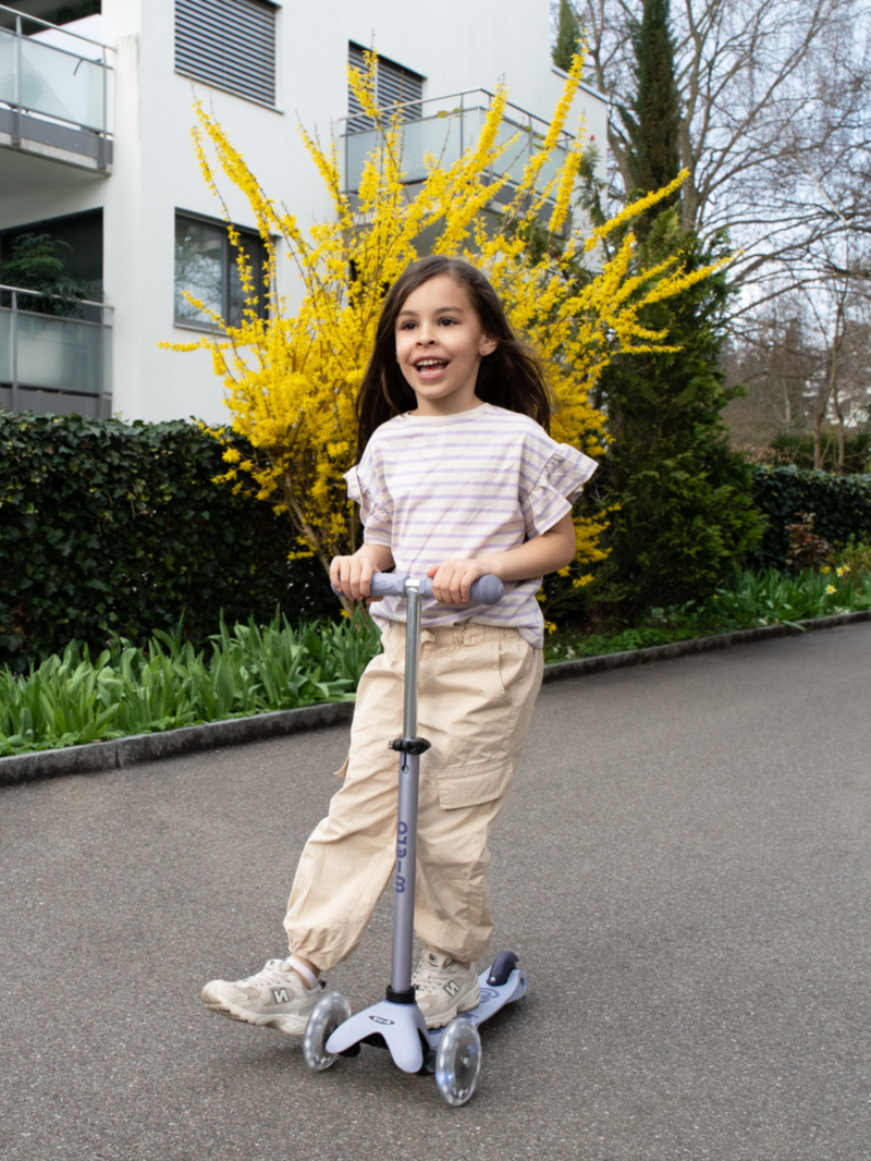 De 3 à 6 ans : la Mini Micro: Le guidon s'ajuste en hauteur pour suivre la croissance de l'enfant. Elle devient une véritable trottinette robuste pour foncer vers l'école !