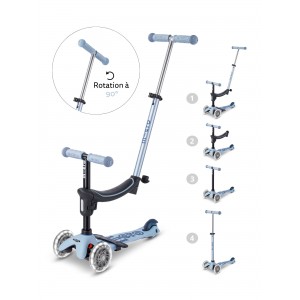 Les trottinettes Mini Micro 3-en-1 grandissent avec votre enfant. Utilisée dans un premier temps comme un porteur (le siège se règle en hauteur), vouspourrez pousser votre enfant avec la barre de poussée télescopique et amovible. En grandissant vous pourrez retirer le siège et votre enfant commencera à appréhender l’utilisation de sa trottinette. Pour finir vous pourrez installer la barre en T.