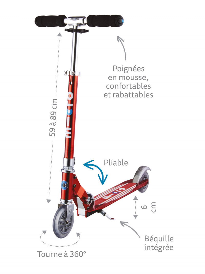 Pour les plus agiles, nous proposons la trottinette Micro Sprite, qui est une trottinette 2 roues. Fabriquée avec 100% d’aluminium, cette trottinette Micro est très légère et compacte. Elle se plie et se range facilement, ce qui permettra à votre enfant de l’emporter n’importe où, sans encombrer votre enfant.