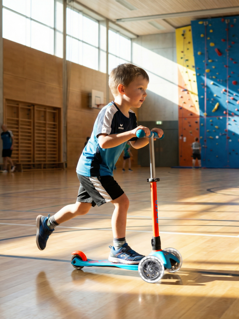 La trottinette utilise le système de direction par transfert de poids propre à Micro. L'enfant incline le guidon pour virer, ce qui sollicite l'équilibre et la coordination motrice sans compromettre la stabilité des trois roues. Les roues avant intègrent des LED blanches alimentées par induction (sans piles), augmentant la visibilité lors des trajets urbains.