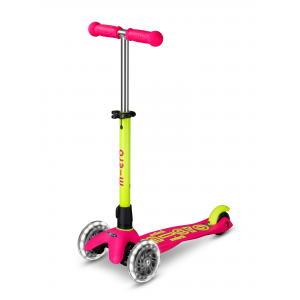 La trottinette 3 roues Mini Micro au design flashy, désormais dotée d'un système de guidon amovible sécurisé pour les 2-5 ans.